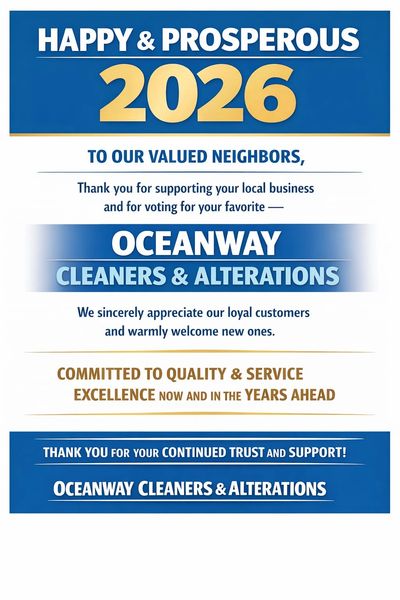 "Reclaim your time! Stop worrying about laundry day. Drop off your comforters, suits, and everyday wear at Oceanway Cleaners & Alterations, and we'll handle the rest. With expert care and convenient service, you can focus on what truly matters. Ask about our seamless pickup and delivery options." s Christmas draws near, we express our genuine appreciation for our customers and neighbors by wishing them holidays filled with joy, warmth, and safety, along with unique savings opportunities. 🍽💛🏠🎉