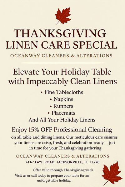 Located in the heart of the community, Oceanway Cleaners is easily accessible for all your dry cleaning needs. Visit us and experience our top-notch services today or let us do the driving for you, for free. Call or text at 904-888-0066 to schedule pickup on Mondays & Thursdays.